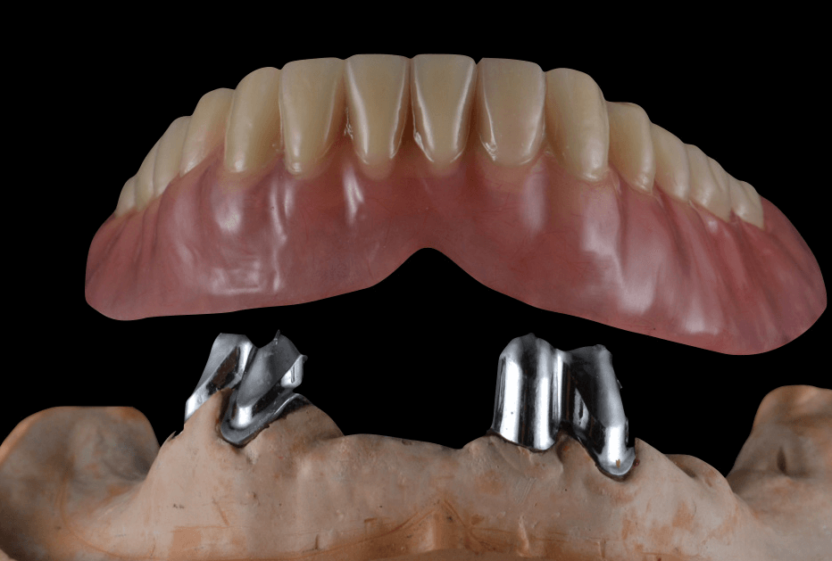 A removable denture that snaps onto 2–4 implants, dramatically increasing stability.